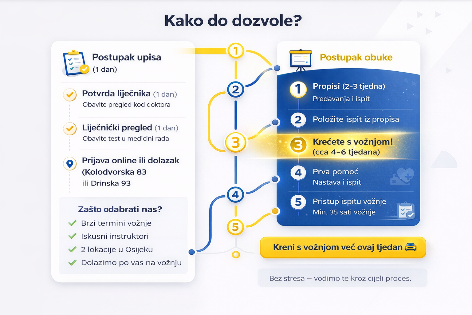 Obuka se sastoji od predavanja iz propisa (PPSP), prve pomoći i minimalno 35 sati vožnje. Sve skupa može biti gotovo za dva mjeseca ukoliko svaki ispit položite iz prvog pokušaja. Ali zbog čekanja na ispitne rokove od strane HAK-a, to bude u prosijeku tri mjeseca.